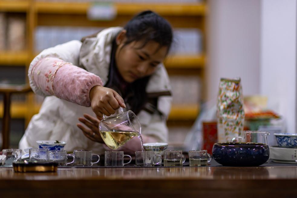 墨脫縣背崩鄉(xiāng)格林村村民袁美華在村里的特產(chǎn)銷售部給游客泡茶。新華社記者姜帆 攝
