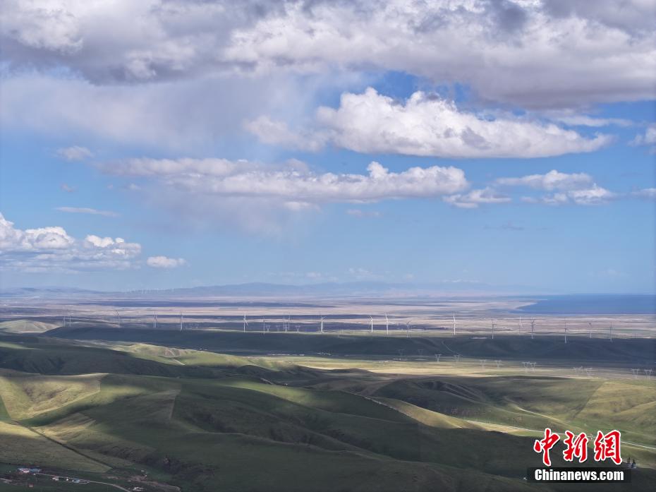 6月4日,航拍青海省海北藏族自治州剛察縣夏日草原秀美風光。地處青海湖北岸的剛察縣,被稱作“海濱藏城”,夏日,連綿的草原綠草萋萋,成群牛羊在山間覓食,遠處的青海湖水天一色,若隱若現(xiàn),風光秀美。(無人機照片)馬銘言 攝