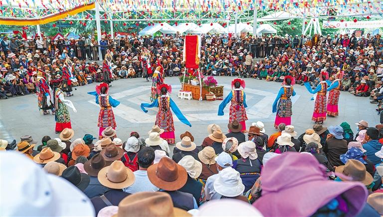 悠悠夏日,氣溫攀升,前往拉薩市宗角祿康公園消夏游玩成為不少市民和游客的選擇。6月9日,由拉薩市文化局主辦的2024年“藏戲演出季”活動在宗角祿康公園啟動。活動為期5天,來自拉薩市各縣(區(qū))的5支民間藏戲團(tuán)隊(duì)將精彩呈現(xiàn)《朗薩雯蚌》《卓娃桑姆》等經(jīng)典傳統(tǒng)劇目。此外,活動現(xiàn)場搭建了購買非遺產(chǎn)品的優(yōu)質(zhì)平臺——拉薩非遺好物集市,對藏香、陶瓷、書法、酸奶、馬具、糌粑、服飾等非遺好物進(jìn)行了展銷。