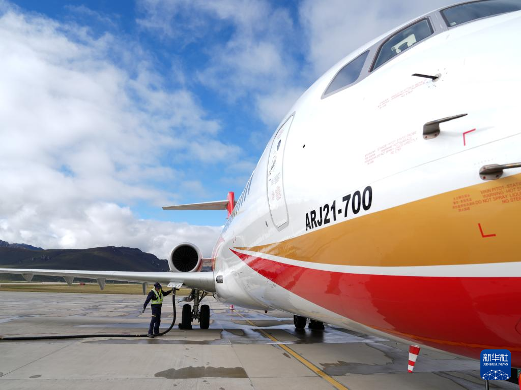 9月21日,國(guó)產(chǎn)商用飛機(jī)ARJ21停放在西藏拉薩貢嘎國(guó)際機(jī)場(chǎng)停機(jī)坪上。新華社記者 丁汀 攝
