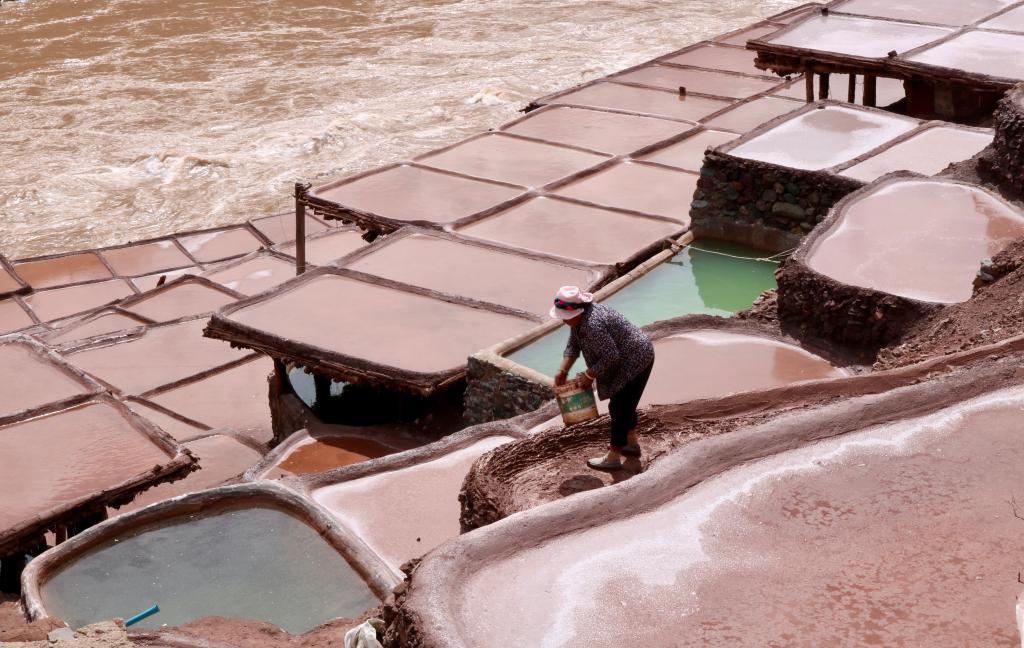 沐浴著陽光和清風,鹽田反射天光。鹽花形狀像桃花瓣,色澤也微紅,讓扎西拉姆想起姥姥和一輩輩鹽井鄉(xiāng)民的臉。她說,鹽是時間的味道,也是人間的味道。