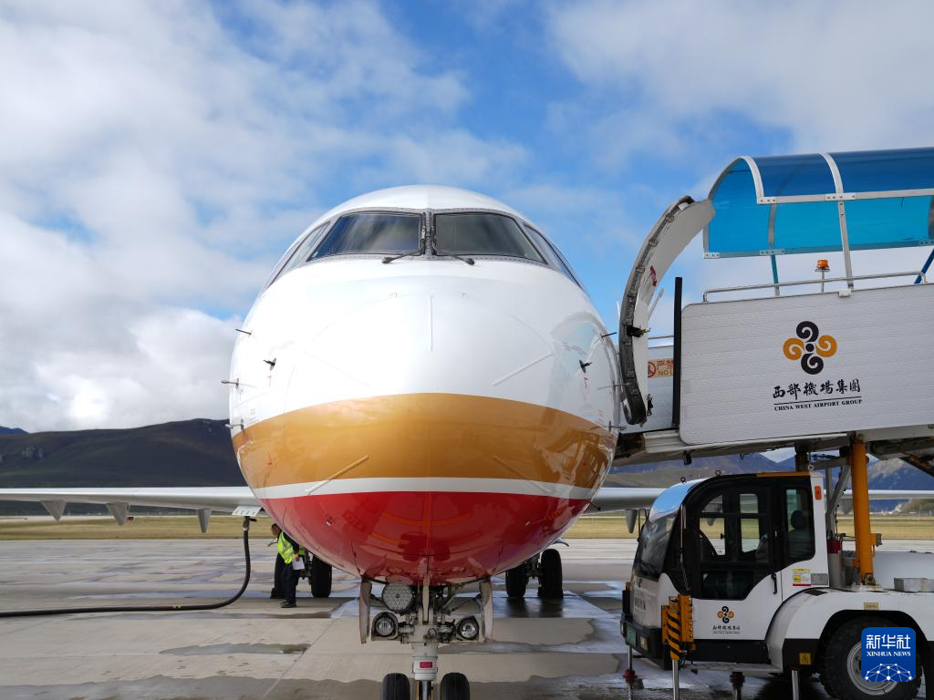 9月21日,國產(chǎn)商用飛機(jī)ARJ21停放在西藏拉薩貢嘎國際機(jī)場(chǎng)停機(jī)坪上。新華社記者 丁汀 攝