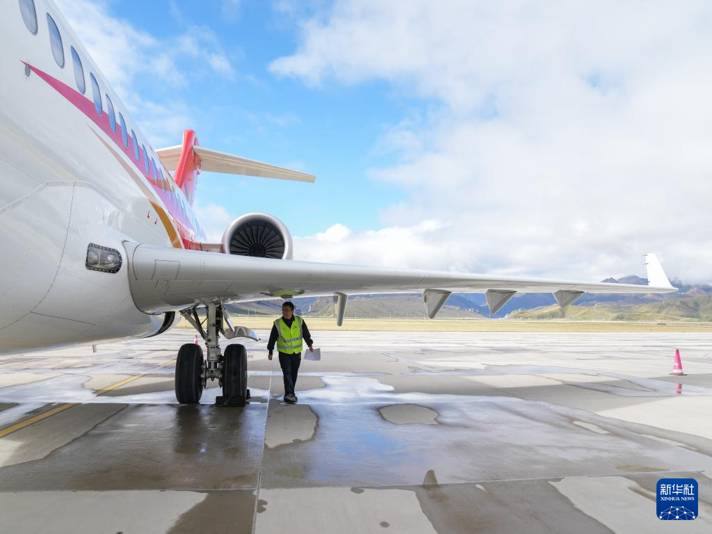 9月21日,在青海果洛瑪沁機(jī)場(chǎng),機(jī)務(wù)人員在對(duì)國產(chǎn)商用飛機(jī)ARJ21進(jìn)行短停檢查。新華社記者 丁汀 攝