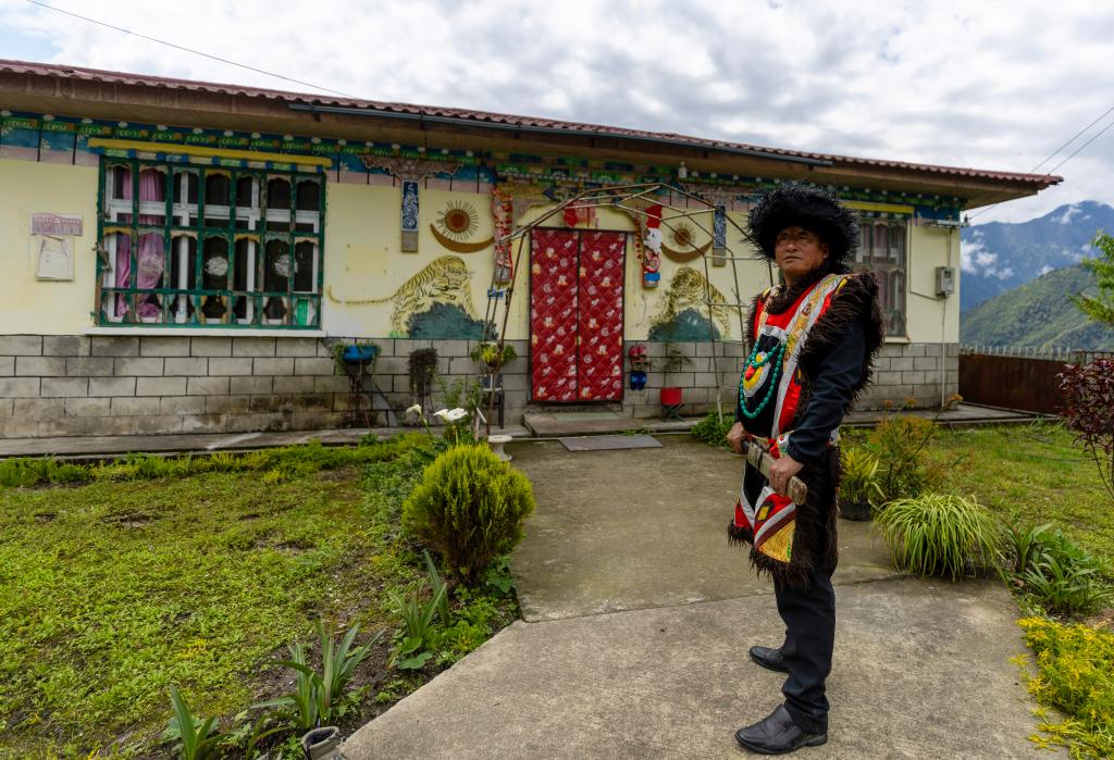 索朗在日常的衣服外披上傳統(tǒng)珞巴服飾為記者做展示(4月25日攝)。新華社記者 姜帆 攝