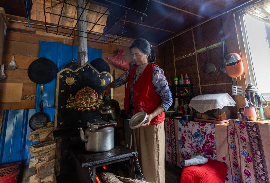 達(dá)木村村民桑杰措姆在家中燒茶。據(jù)她介紹,這火爐是公路通車(chē)前家里人走山路從100多公里外背回來(lái)的,非常具有紀(jì)念意義(4月25日攝)。新華社記者 姜帆 攝