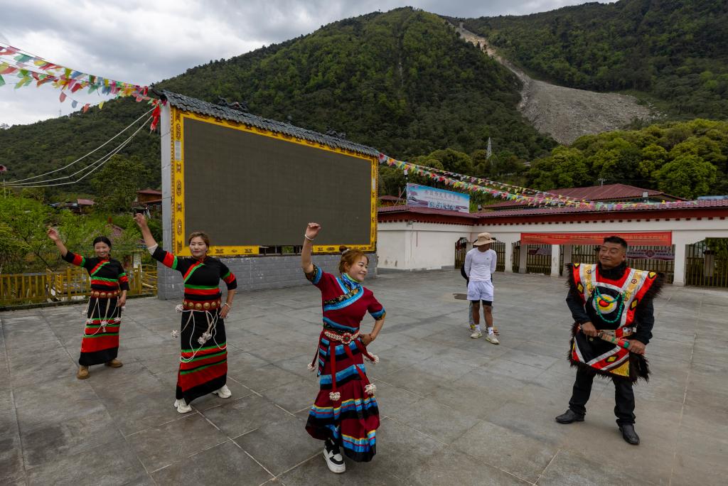 索朗(右一)在村里的廣場(chǎng)上指導(dǎo)年輕一代跳“刀舞”(4月25日攝)。新華社記者 姜帆 攝