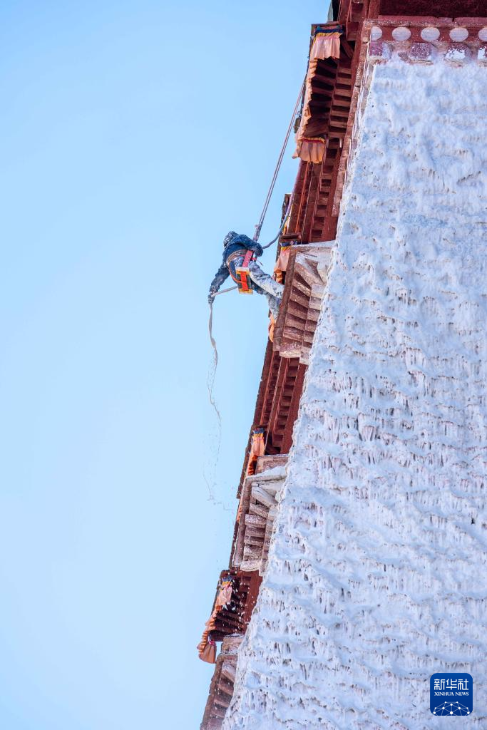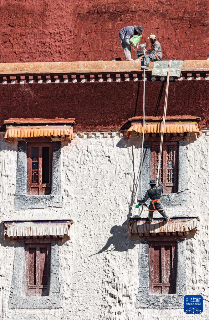 10月30日,布達拉宮管理處的工作人員在噴灑涂料。新華社記者 晉美多吉 攝 ??