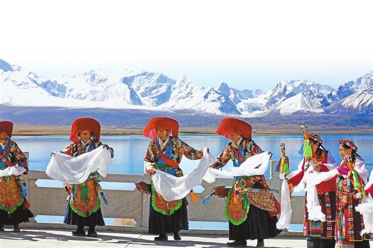 群眾在佩枯錯(cuò)湖畔表演非遺歌舞乃龍甲諧。本報(bào)記者 旦增嘎瓦 攝