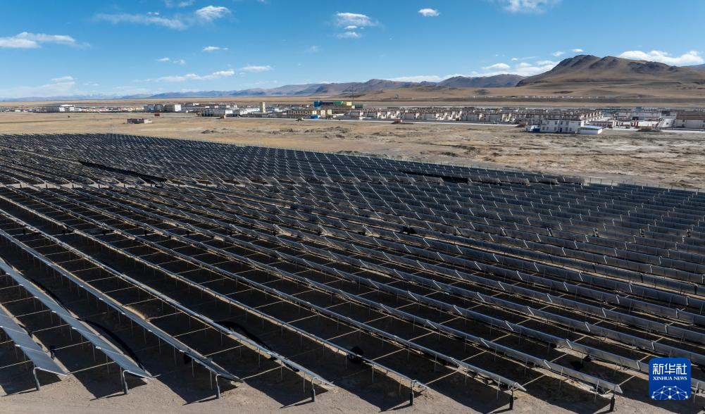 鳥瞰措勤縣城區(qū)清潔能源集中供暖特許經(jīng)營(yíng)項(xiàng)目的光伏陣列(無(wú)人機(jī)照片,11月20日攝)。新華社記者 姜帆 攝 ??