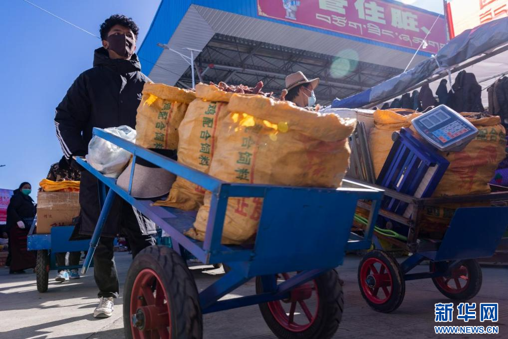 圖為物交會(huì)上,商戶(hù)在運(yùn)送牦牛肉干(12月2日攝)。新華網(wǎng)發(fā) 李騰 攝