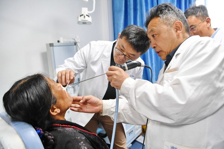 中國醫(yī)學科學院整形外科醫(yī)院王克明博士(左后)和西藏自治區(qū)人民醫(yī)院巴羅主任(右前)為患者查體(2024年8月27日攝)。新華社記者 張汝鋒 攝