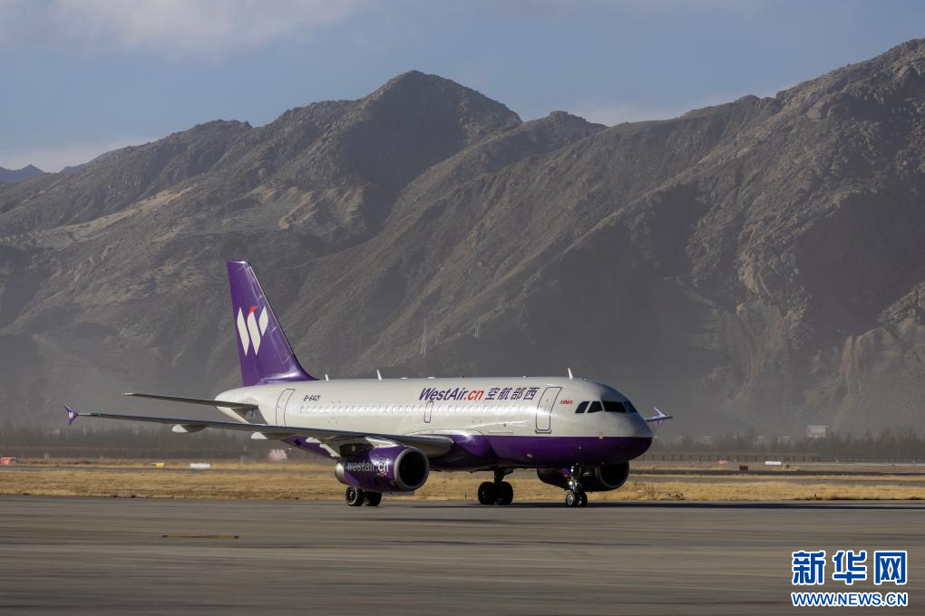 25日,執(zhí)飛拉薩-重慶-新加坡國(guó)際新航線首飛任務(wù)的西部航空PN6425客運(yùn)航班降落在拉薩貢嘎國(guó)際機(jī)場(chǎng)。新華社記者 姜帆 攝