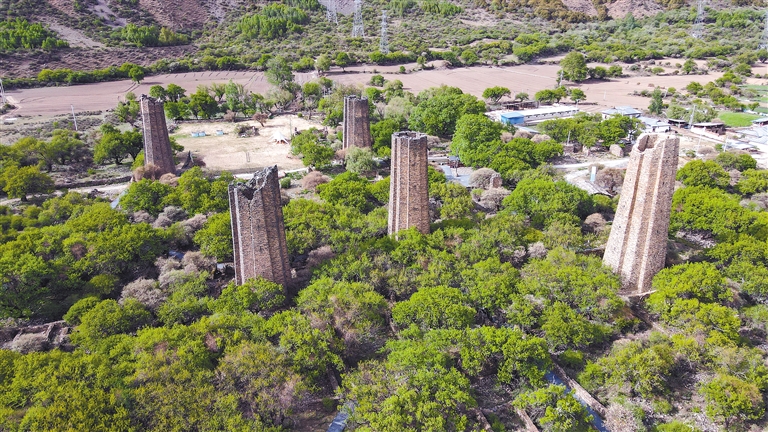 這些堡壘通體呈土黃色、棕褐色,主要由片石、木頭壘砌而成,內(nèi)部嵌有木梁,既起到了支撐作用,又能供人攀爬至堡頂。堡壘墻厚2米,從基部到頂部逐步縮小,中間空洞,沒(méi)有頂蓋,周身有對(duì)稱的孔洞,內(nèi)部呈八角狀,外觀則棱角分明,呈現(xiàn)出十二面十二棱的棱柱狀,造型設(shè)計(jì)巧妙牢固且氣勢(shì)恢宏,彰顯了千年以前青藏高原上高超的建筑技藝。
