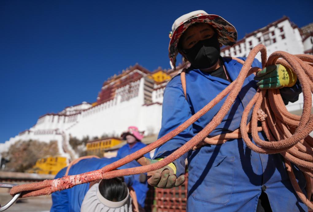 維修科工匠扎西在布達(dá)拉宮前。新華社記者 晉美多吉 攝