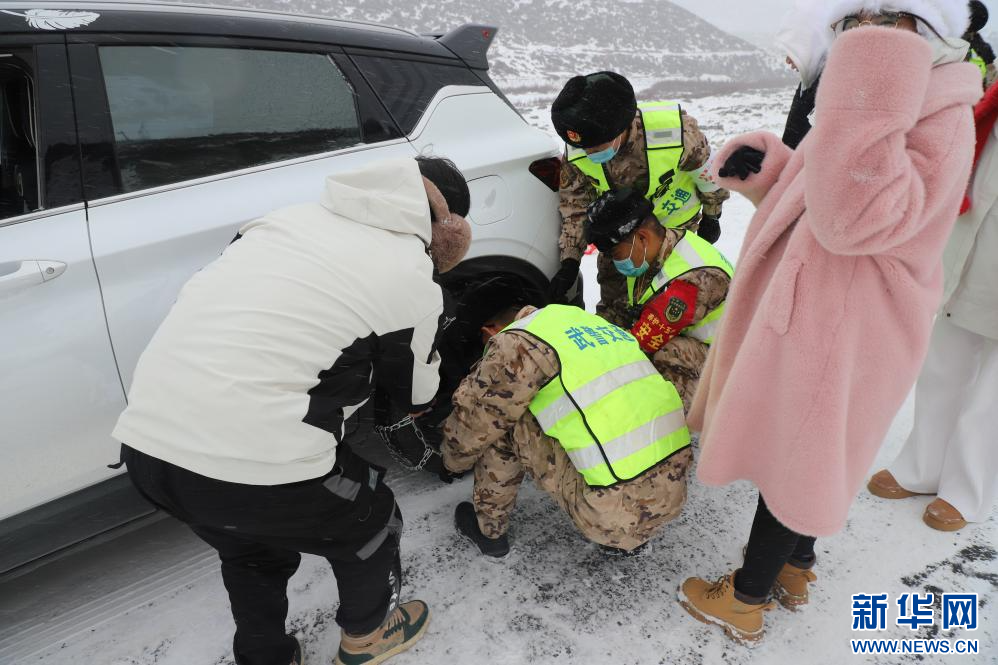 這是官兵在幫助車輛加裝防滑鏈。(受訪者供圖)