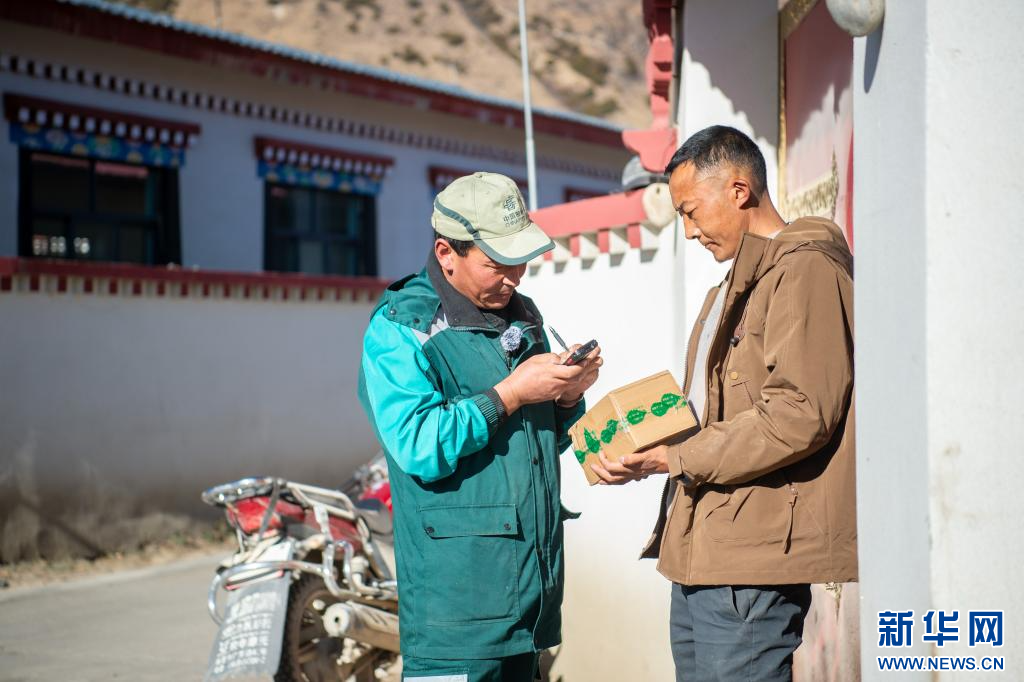 1月19日拍攝的郵遞員為村民派送快遞。新華網(wǎng) 旦增努布 攝