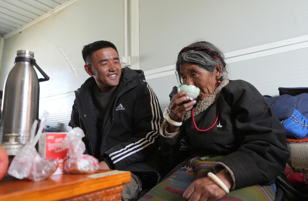 達(dá)娃次仁在救災(zāi)帳篷見到了母親次仁塔覺。這位66歲的藏族老阿媽,身體硬朗,精神矍鑠,是全家人的“精神依靠”。