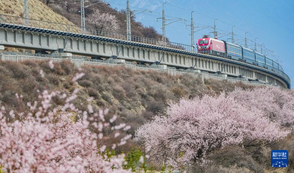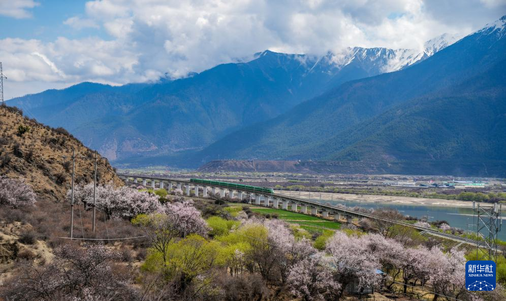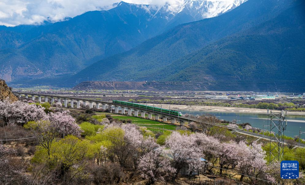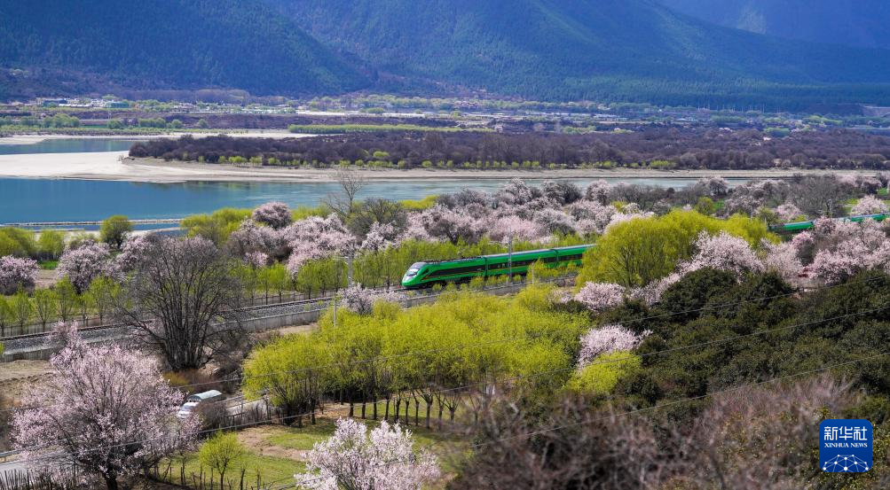 四月,藏東南河谷桃花初綻,車窗外雪山與桃林交相輝映,拉林鐵路列車穿行在桃花掩映的尼洋河畔,繪就高原獨(dú)有的春之畫卷。