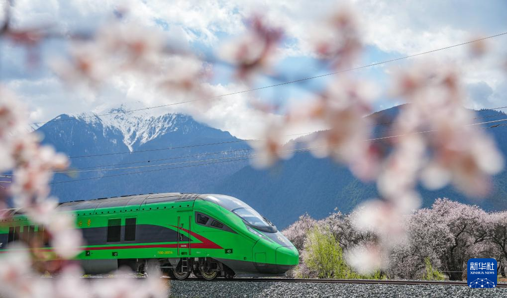 當(dāng)列車駛?cè)肓种ゾ硟?nèi),桃花的盛景會(huì)達(dá)到高潮,野生桃花漫山遍野。車在花中跑,人在畫中游,馳騁的復(fù)興號(hào)動(dòng)車與鐵道旁盛開的桃花構(gòu)成了一幅人與自然和諧共生的畫卷?!暗谝淮慰吹綇?fù)興號(hào)從眼前飛馳而過,就像看見家鄉(xiāng)的雄鷹掠過雪山。”林芝站安檢員德吉拉姆說。