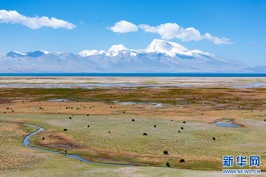 遠(yuǎn)處的瑪旁雍錯(cuò)與濕地內(nèi)覓草的牦牛(6月9日攝,無(wú)人機(jī)照片)。新華網(wǎng) 旦增努布 攝