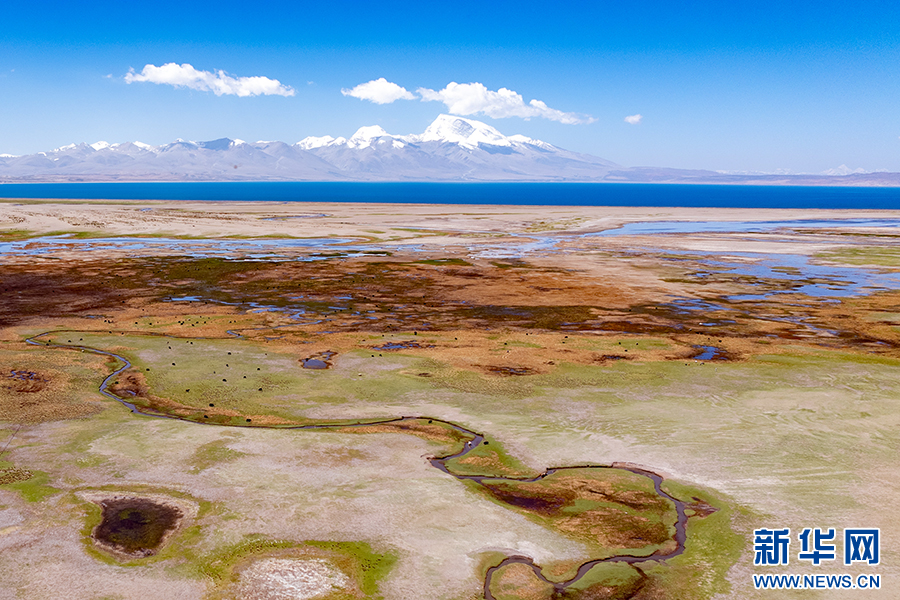 遠(yuǎn)處的瑪旁雍錯(cuò)與綠意漸濃的濕地(6月9日攝,無(wú)人機(jī)照片)。新華網(wǎng) 旦增努布 攝
