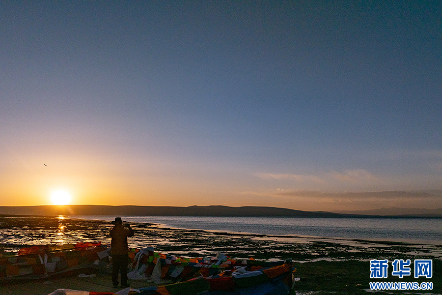 夕陽(yáng)下,游客在瑪旁雍錯(cuò)邊游玩。(6月9日攝)。新華網(wǎng) 旦增努布 攝