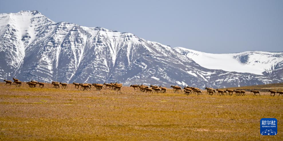 一群雌性藏羚羊在羌塘國家級自然保護(hù)區(qū)核心區(qū)內(nèi)進(jìn)行繁殖遷徙(6月10日攝)。新華社記者 劉金海 攝