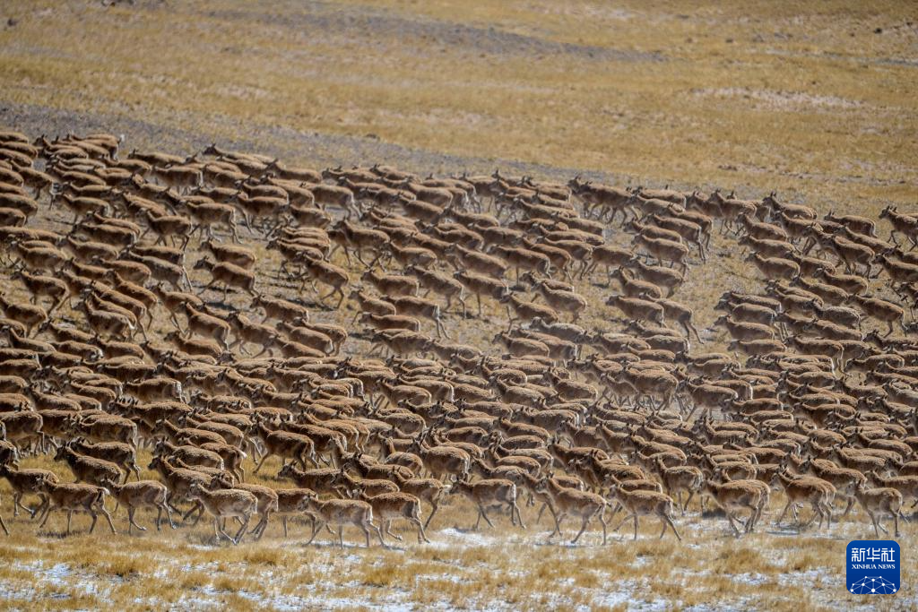 在羌塘國家級自然保護(hù)區(qū)核心區(qū)拍攝的遷徙中的雌藏羚羊群(6月9日攝)。新華社記者 旦增尼瑪曲珠 攝 ??