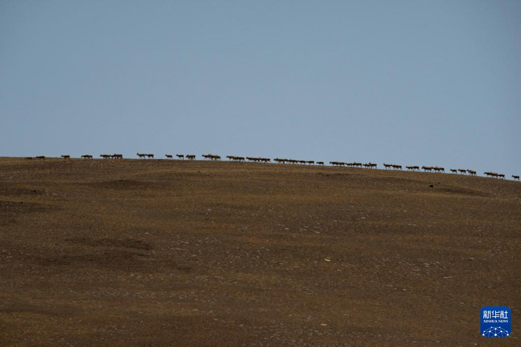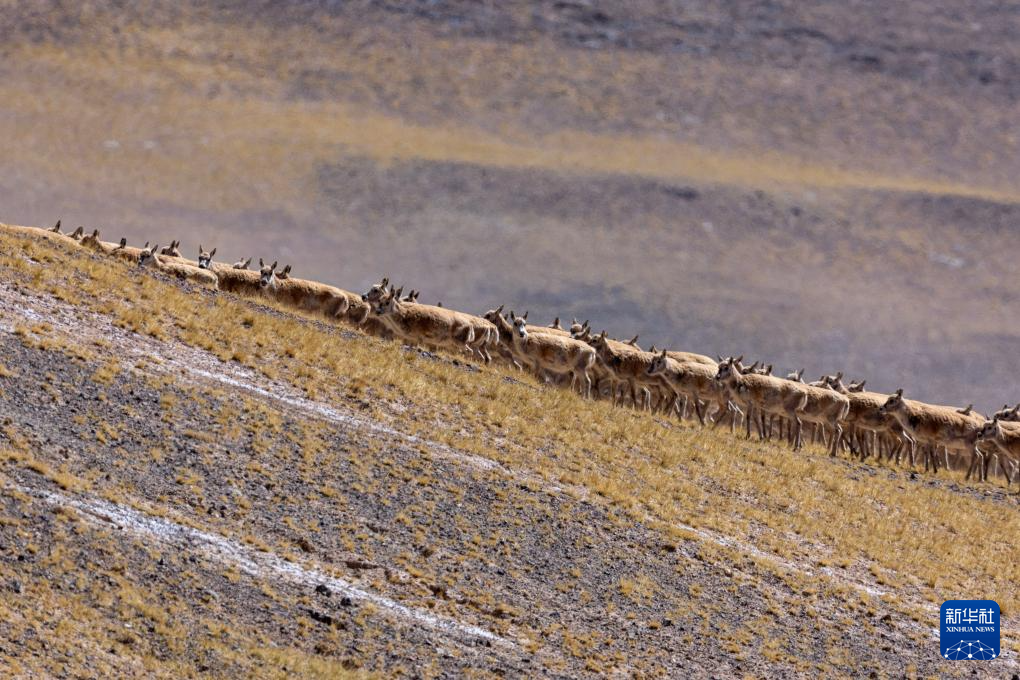 在羌塘國家級自然保護(hù)區(qū)核心區(qū)拍攝的遷徙中的雌性藏羚羊群(6月8日攝)。新華社記者 旦增尼瑪曲珠 攝 ??