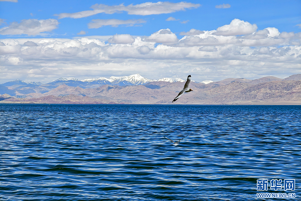 班公湖上飛翔的鳥兒(6月15日攝,無(wú)人機(jī)照片)。新華網(wǎng) 旦增努布 攝