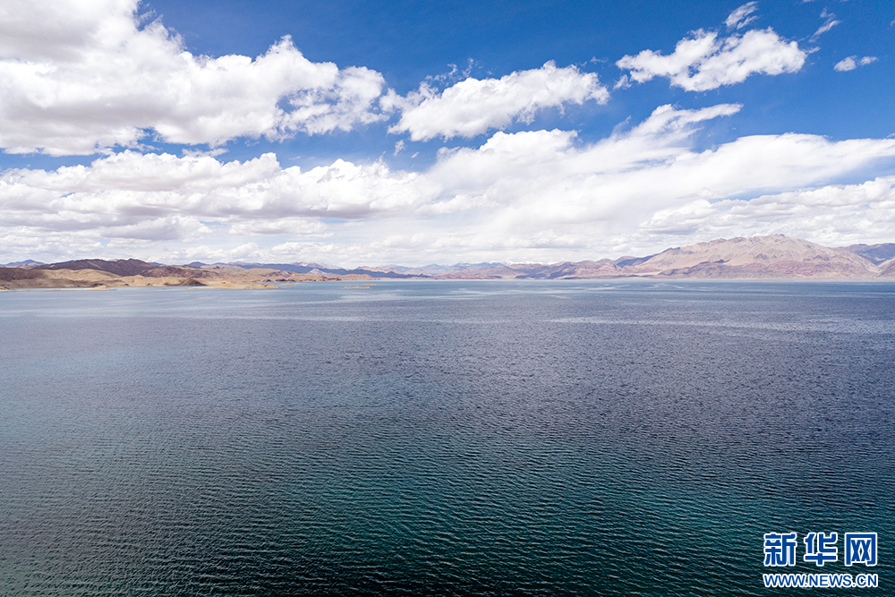 藍(lán)天白云映襯下的班公湖(6月15日攝,無(wú)人機(jī)照片)。新華網(wǎng) 旦增努布 攝