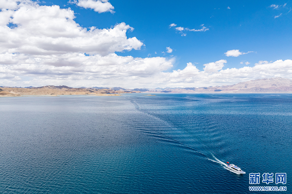 一艘游艇在班公湖上行駛(6月15日攝,無(wú)人機(jī)照片)。新華網(wǎng) 旦增努布 攝