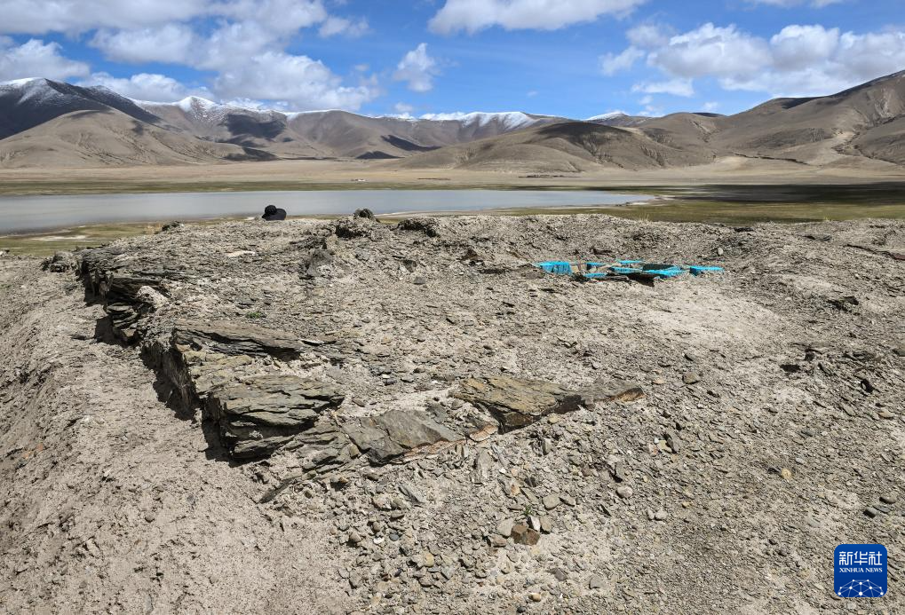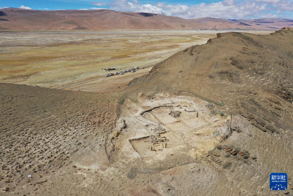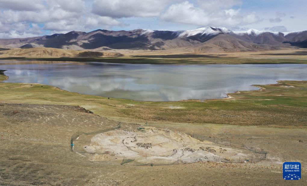 這是5月22日拍攝的坐落在瑪不錯湖畔的遺址第四期石構(gòu)地面建筑考古發(fā)掘現(xiàn)場(無人機照片)。新華社記者 李賀 攝 ??