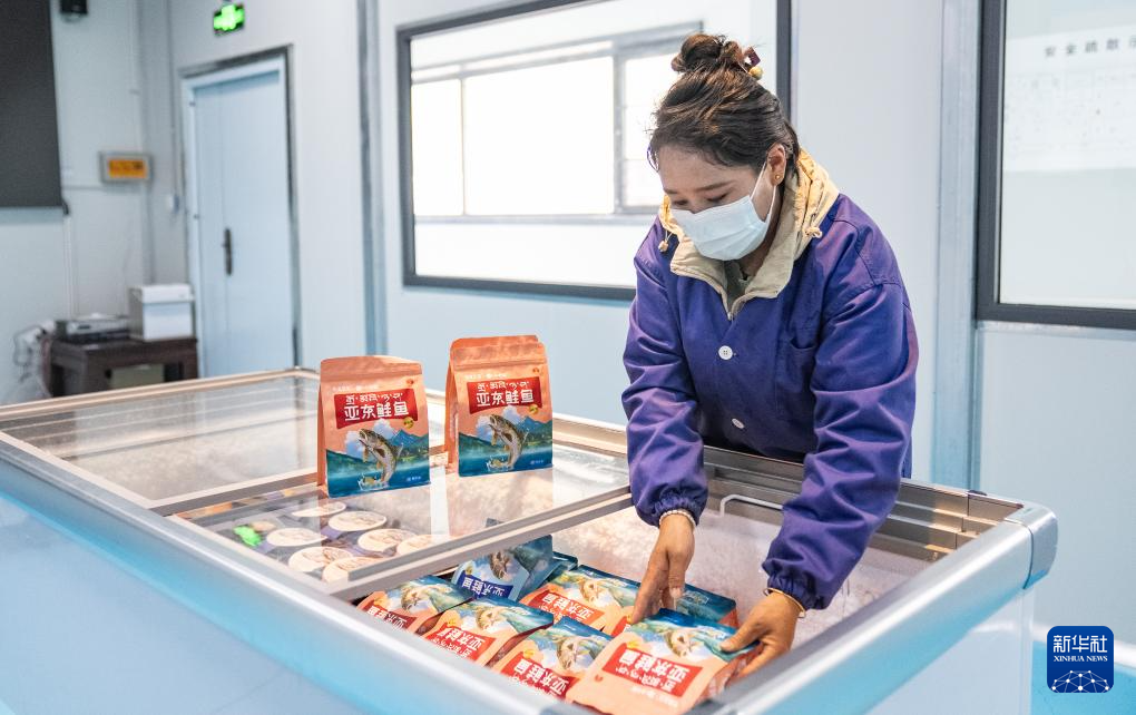 工作人員在車間內(nèi)將亞東鮭魚的加工產(chǎn)品放入冷藏柜(6月19日攝)。新華社記者 丁增尼達(dá) 攝 ??