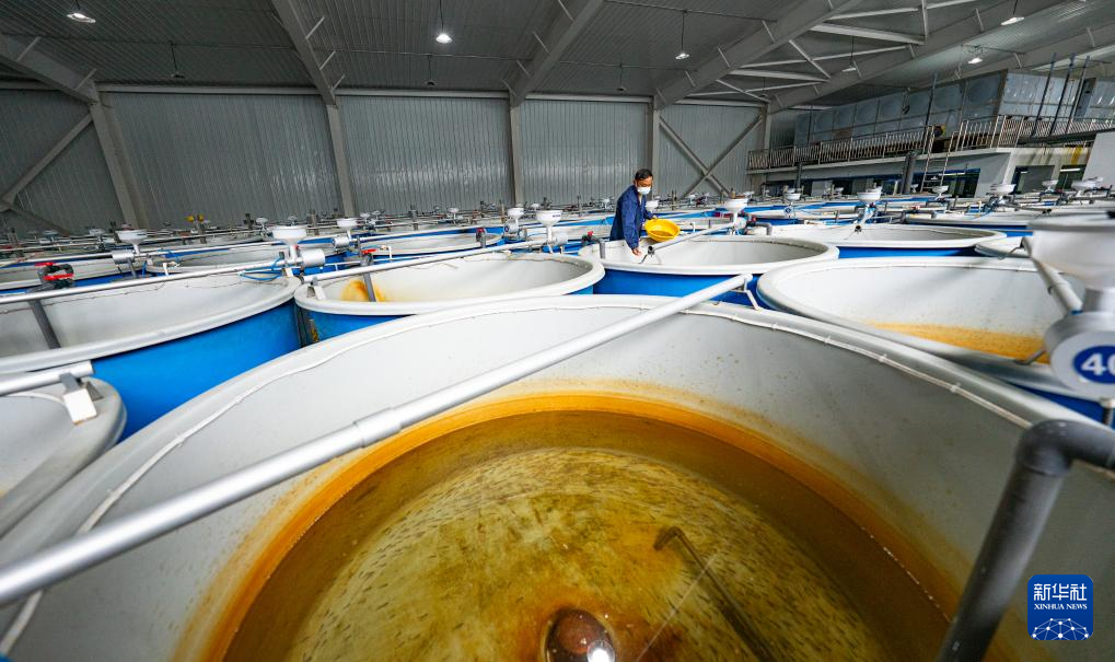 工作人員在育苗車間給亞東鮭魚魚苗喂食(6月19日攝)。新華社記者 丁增尼達(dá) 攝 ??