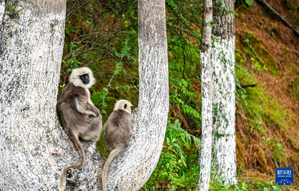 6月20日,在日喀則市亞東縣,兩只長(zhǎng)尾葉猴在樹上休息。新華社記者 丁增尼達(dá) 攝