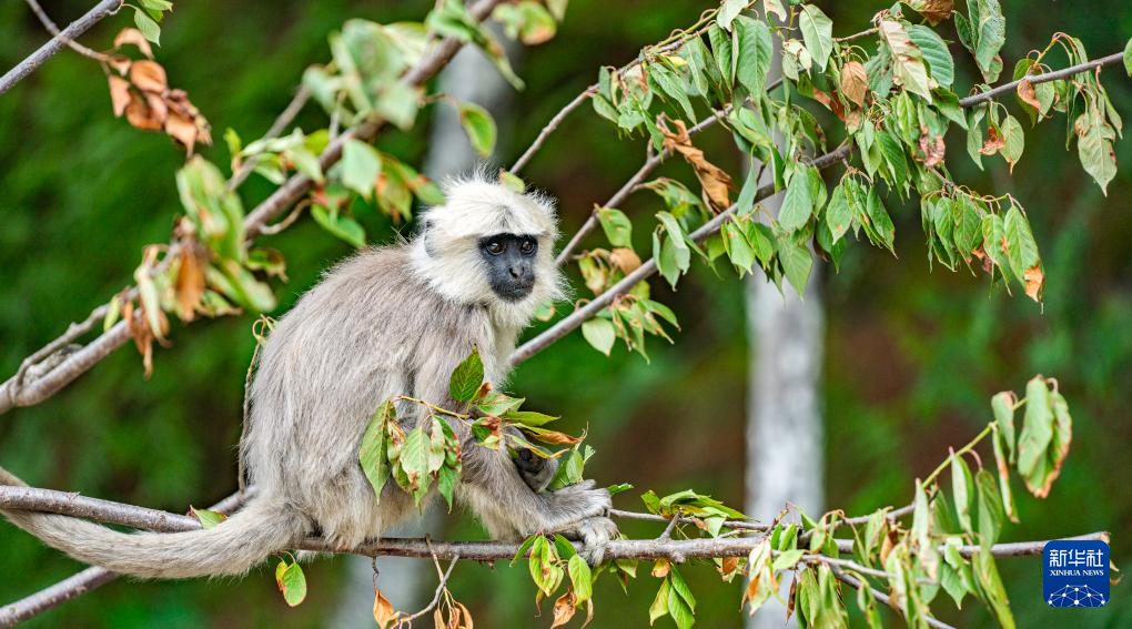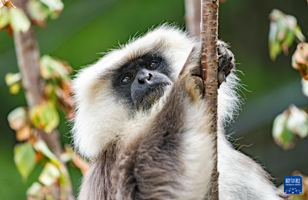 6月20日,在日喀則市亞東縣,一只長(zhǎng)尾葉猴在樹枝上玩耍。新華社記者 丁增尼達(dá) 攝 ??