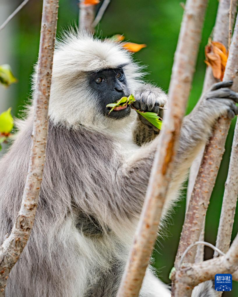 6月20日,在日喀則市亞東縣,一只長(zhǎng)尾葉猴在吃樹葉。新華社記者 丁增尼達(dá) 攝 ??