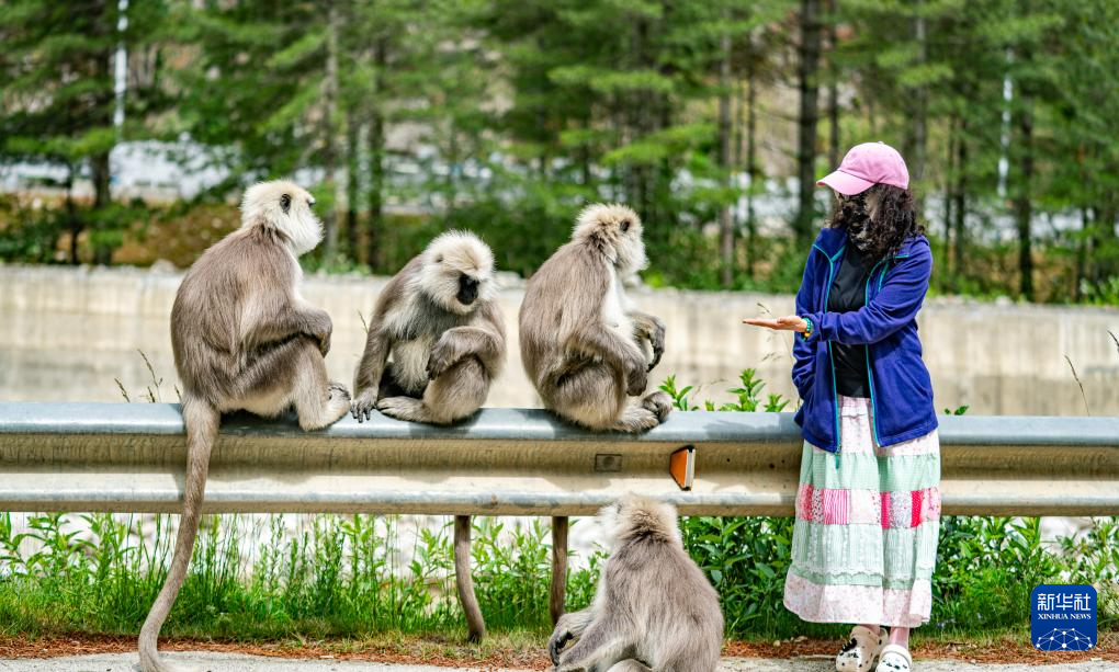 6月20日,在亞東縣一條公路邊,游客在和長(zhǎng)尾葉猴互動(dòng)。新華社記者 丁增尼達(dá) 攝 ??