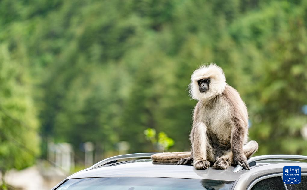 6月20日,在亞東縣一條公路邊,一只長(zhǎng)尾葉猴蹲坐在車頂休息觀望。新華社記者 丁增尼達(dá) 攝