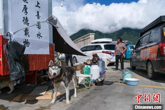 6月29日,西藏林芝宇拓公園自駕露營地的哈士奇,它跟隨主人乘電動(dòng)三輪車進(jìn)藏。中新社記者 江飛波 攝
