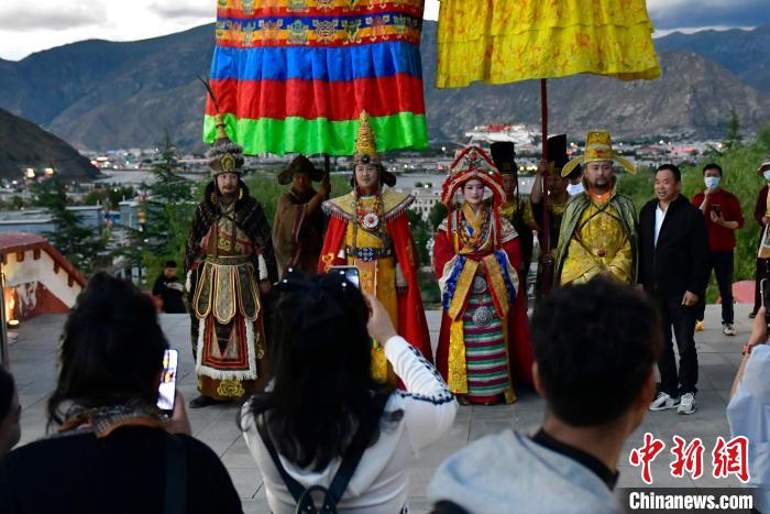 圖為《文成公主》大型實景劇演員在文成公主藏文化風情園巡游,與游客互動。李林 攝