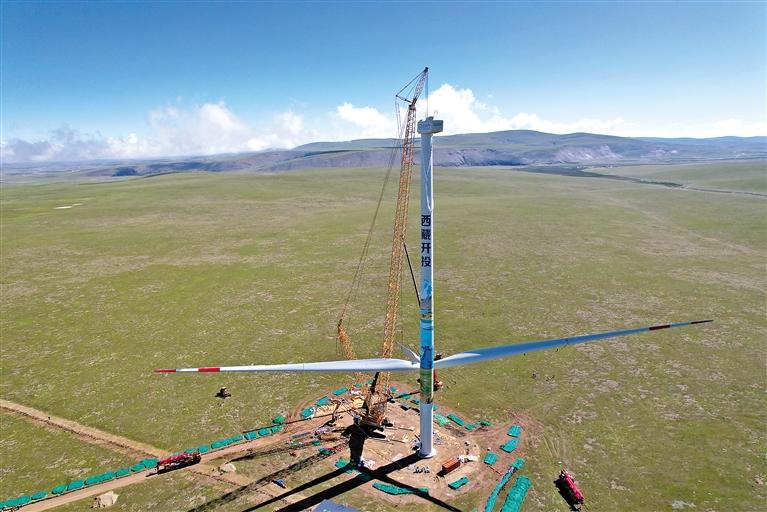 圖為西藏開投色尼區(qū)曲果嘎姆200MW風電項目首臺風電機組吊裝現(xiàn)場。周俊 李梅英 攝