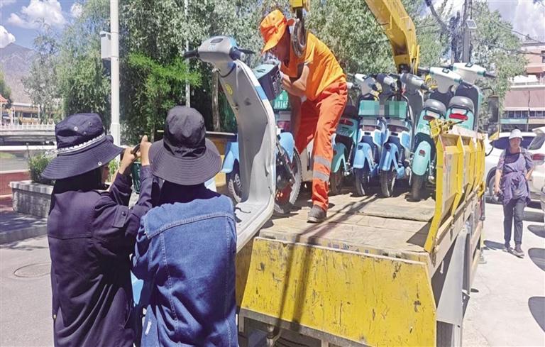 工作人員督促企業(yè)調(diào)離轄區(qū)超量共享電動車。圖由城關(guān)區(qū)城管局提供