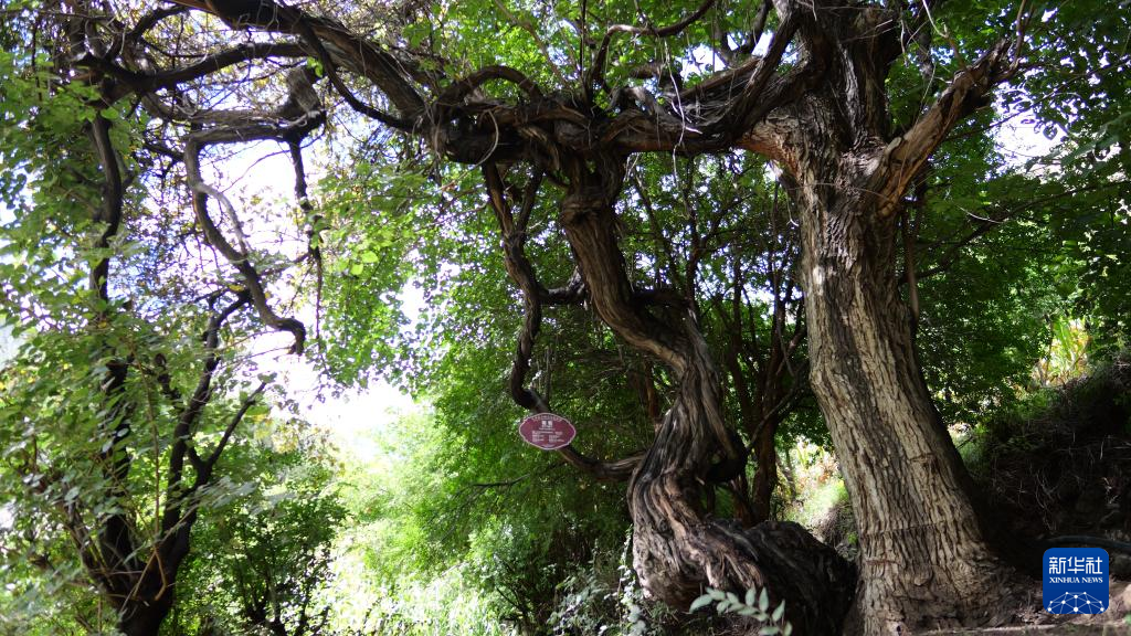 這是9月12日拍攝的左貢縣繞金鄉(xiāng)左巴村野生古葡萄樹(左),樹齡達(dá)416年。新華社記者 格桑朗杰 攝
