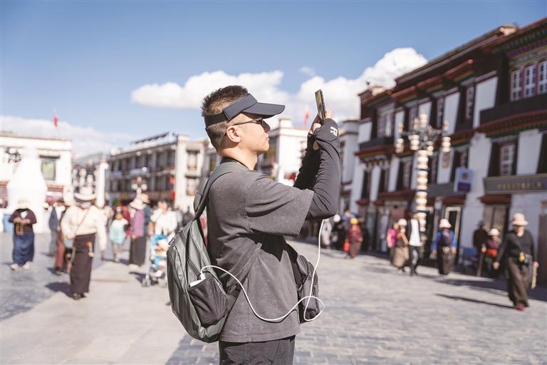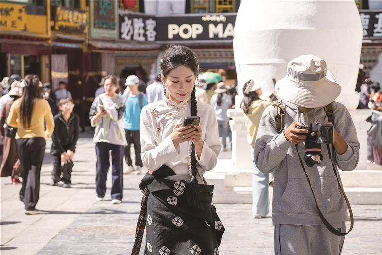 街巷里,來(lái)自五湖四海的游客們開(kāi)始穿梭在八廓街蜿蜒曲折的街巷中。他們滿懷好奇,感受著這里獨(dú)特的風(fēng)土人情。不少游客興致勃勃地穿上一套精美的藏裝,搖身一變成為高原上美麗的“卓瑪”與帥氣的“扎西”。他們?cè)诠沤值拿恳粋€(gè)角落留下自己的身影,臉上洋溢著對(duì)這片土地的喜愛(ài)與贊嘆。