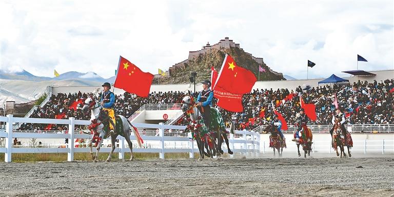 開幕式上,100匹駿馬踏著鼓點(diǎn)奔騰而來(lái)。騎手們手持國(guó)旗,馬鬃飛揚(yáng),金黃的青稞穗與潔白的哈達(dá)交織成畫。緊隨其后的方隊(duì)演繹著傳統(tǒng)與現(xiàn)代的對(duì)話,深情表達(dá)了江孜人民對(duì)黨的無(wú)限感恩、對(duì)祖國(guó)的無(wú)限熱愛、對(duì)西藏繁榮發(fā)展的美好祝愿。