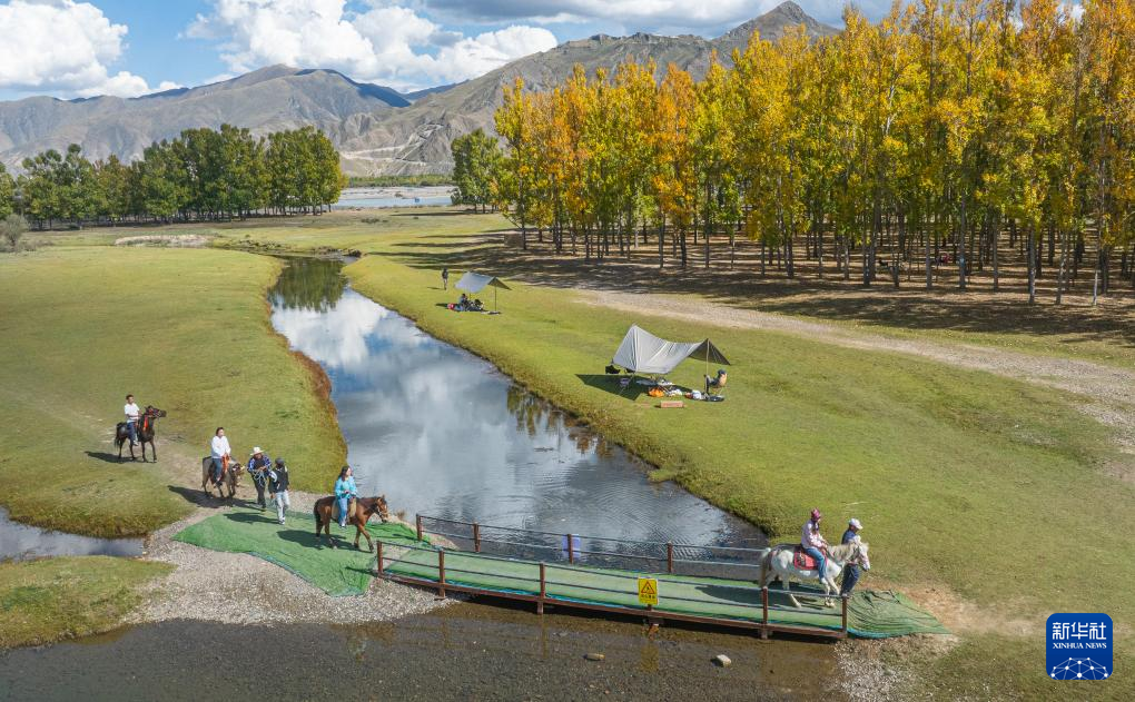 游客們在拉薩市林周縣“神秘樹林”林卡營地體驗(yàn)騎馬(9月27日攝,無人機(jī)照片)。新華社記者 丁增尼達(dá) 攝??