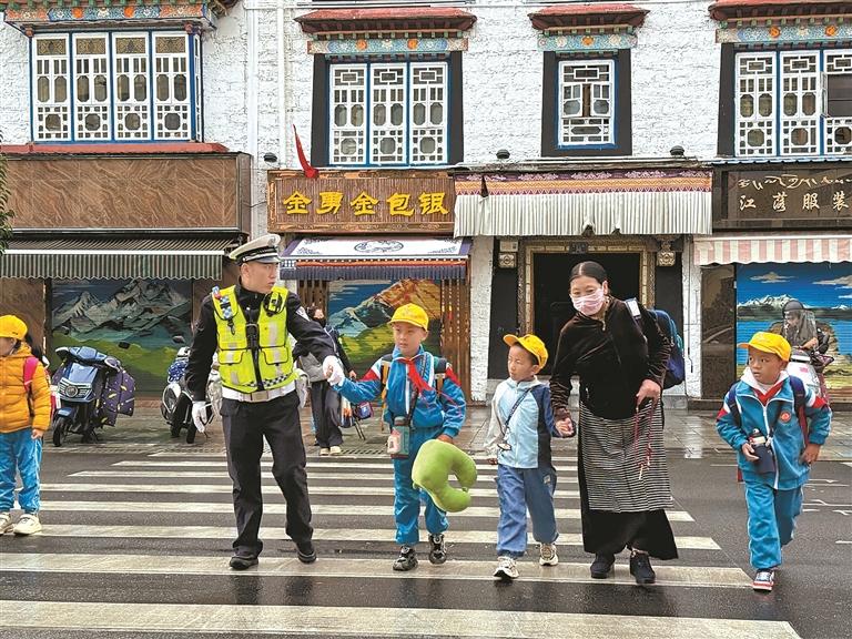 圖為拉薩市公安局交通管理支隊(duì)民警幫助獨(dú)行的學(xué)生穿過(guò)車(chē)流。記者 鹿麗娟 攝