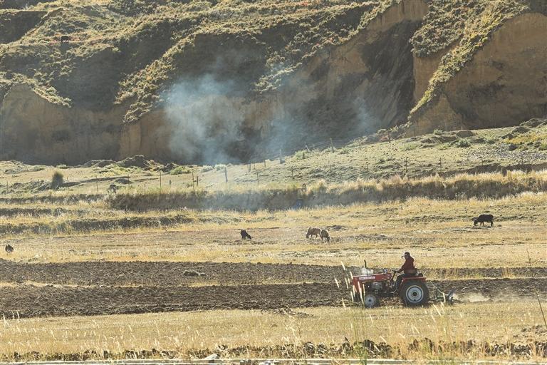 在鄉(xiāng)村農(nóng)田里,轟鳴的拖拉機(jī)穿梭田間,犁鐮將收割后的麥茬深深翻入地下,黝黑的土壤隨之顯露;成群的牦牛也成為田間主角,與村民、機(jī)械協(xié)同作業(yè),確保秋翻工作按時完成。“秋翻不僅能疏松土壤、改善土壤結(jié)構(gòu),還可將殘留秸稈深埋,有效增加土壤肥力,為來年農(nóng)業(yè)生產(chǎn)打下堅實基礎(chǔ)?!崩_市墨竹工卡縣一村民表示,此次秋翻作業(yè)既保障了前期糧食顆粒歸倉,也為后續(xù)春耕生產(chǎn)做好了充分準(zhǔn)備。